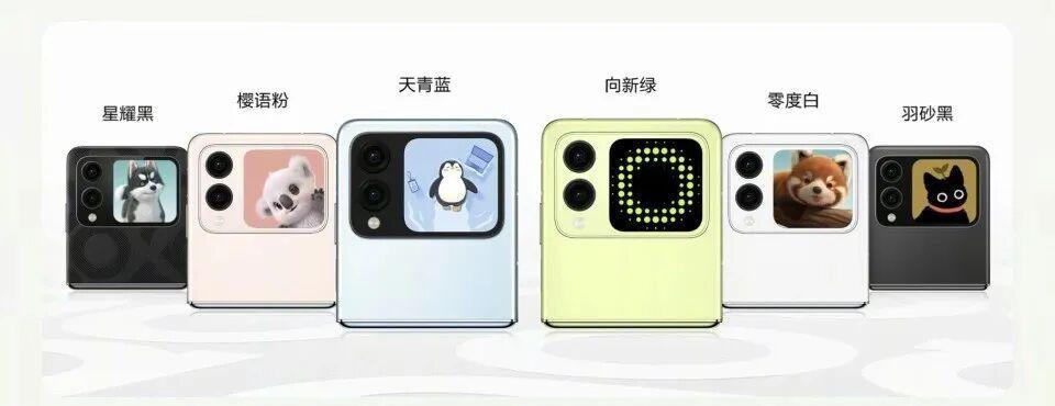 外观其实跟华为 nova Flip 一样的,1:1 方形外屏,2.14 英寸,480 × 480 像素,支持通话趣显、可爱萌宠、DIY 壁纸、互动等主题;