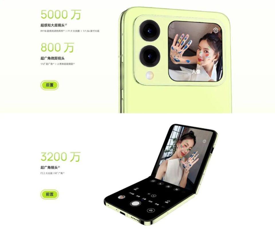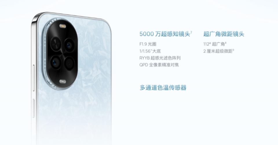 后置 5000 万像素 RYYB 主摄(F1.9 光圈),1/1.56" 大底 CMOS ,800 万像素超广角微距镜头(F2.2 光圈);支持 10 倍数字变焦;